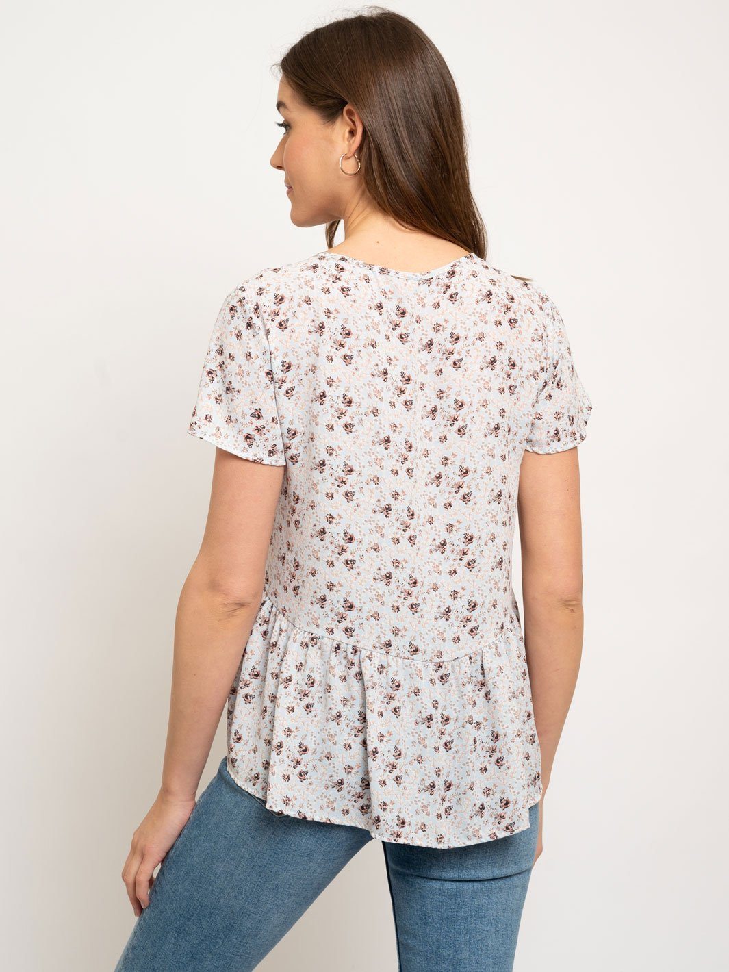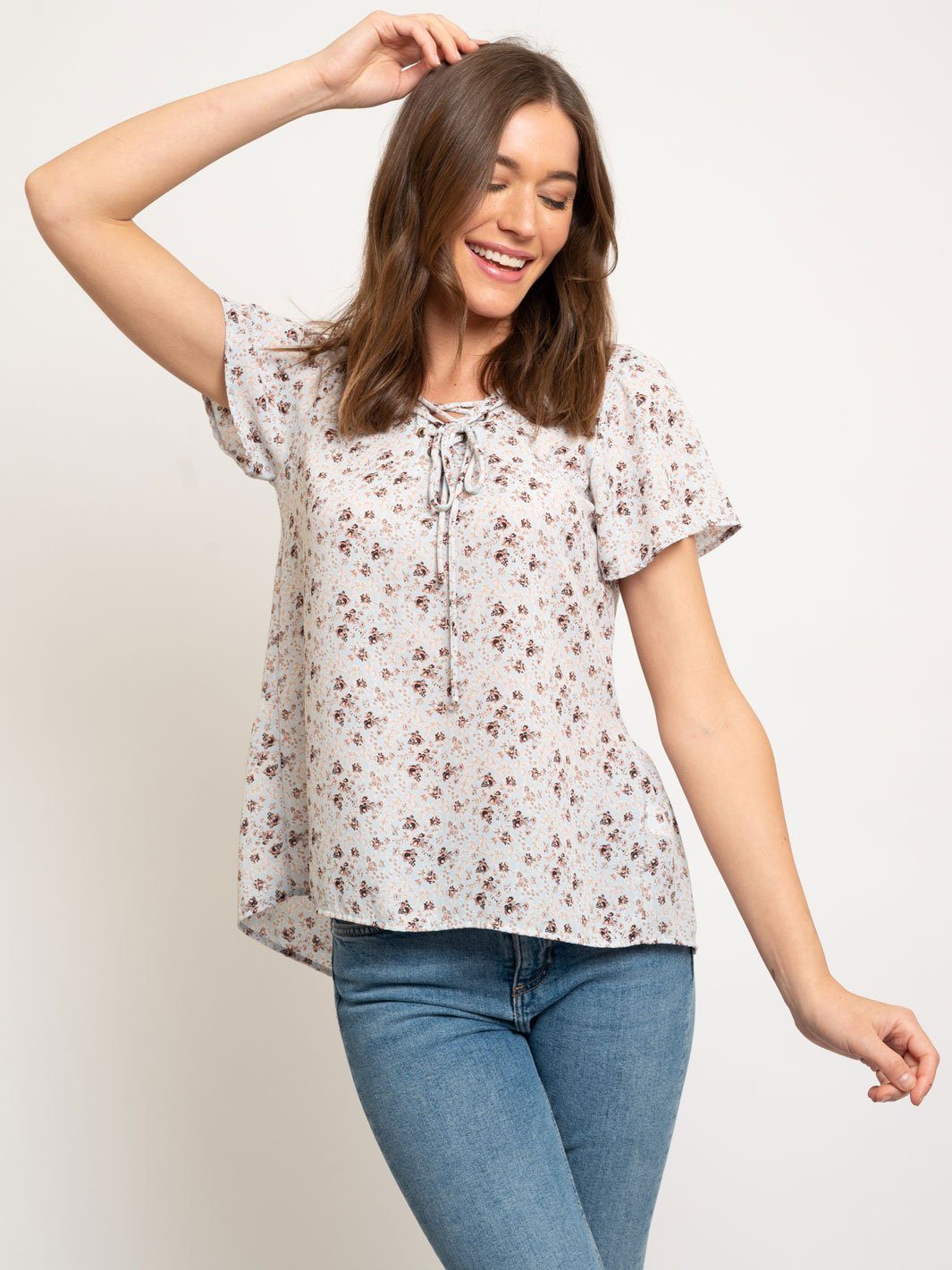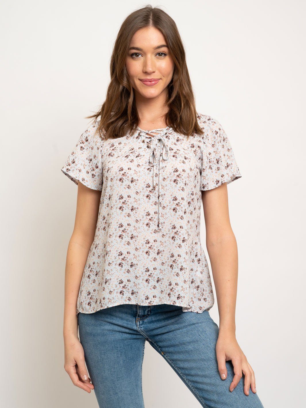 Features:Lightweight and breathable, flattering tie-front design, vibrant floral print, perfect for layering, machine washable, made in the USA, available in various sizes.
