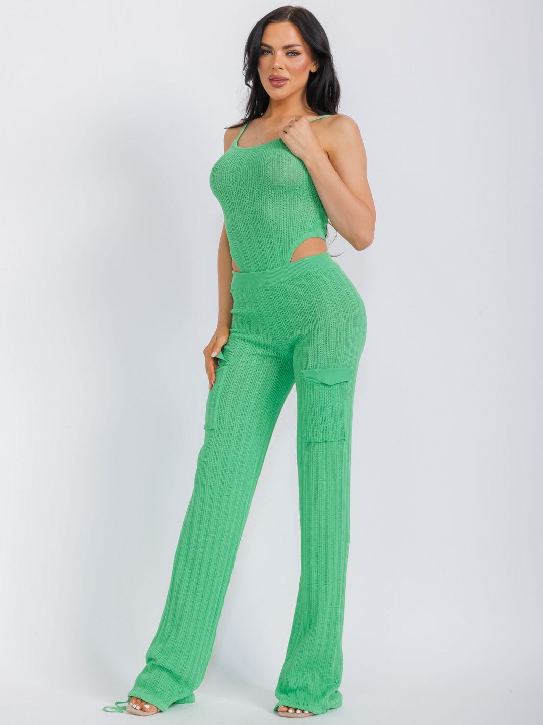 Features:Breathable, versatile design, sleeveless bodysuit, wide leg pants, knit fabric, comfortable fit.
