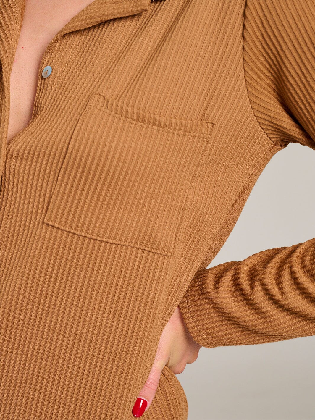 Elevate your boutique's offering with this ribbed knit long sleeve blouse. Crafted from a premium polyester blend, this top features a button closure and convenient front pocket, making it an ideal choice for chic, casual styling. Its versatile design is perfect for trend-forward layering during transitional seasons, ensuring it remains a bestseller with boutiques and online retailers alike.