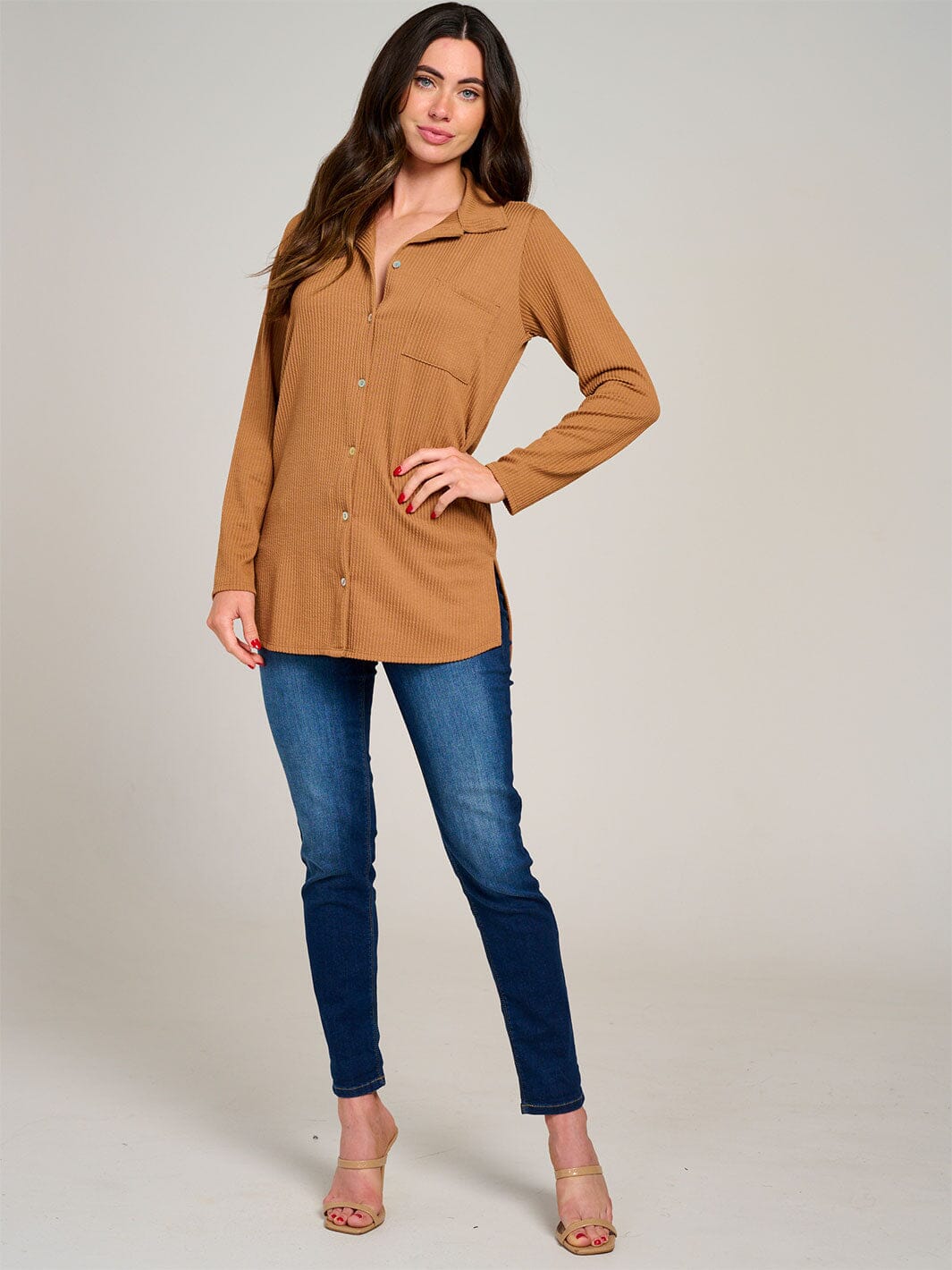 Complete the look:This women's ribbed button-up top is a staple that appeals to boutiques due to its attractive markup potential and demand across diverse customer bases. Its trend-forward design and reliable reorder availability make it a valuable addition to any retail collection, whether featured on in-store displays or online platforms. This top's versatility ensures it remains a popular choice for savvy buyers looking to enhance their merchandise lineup.