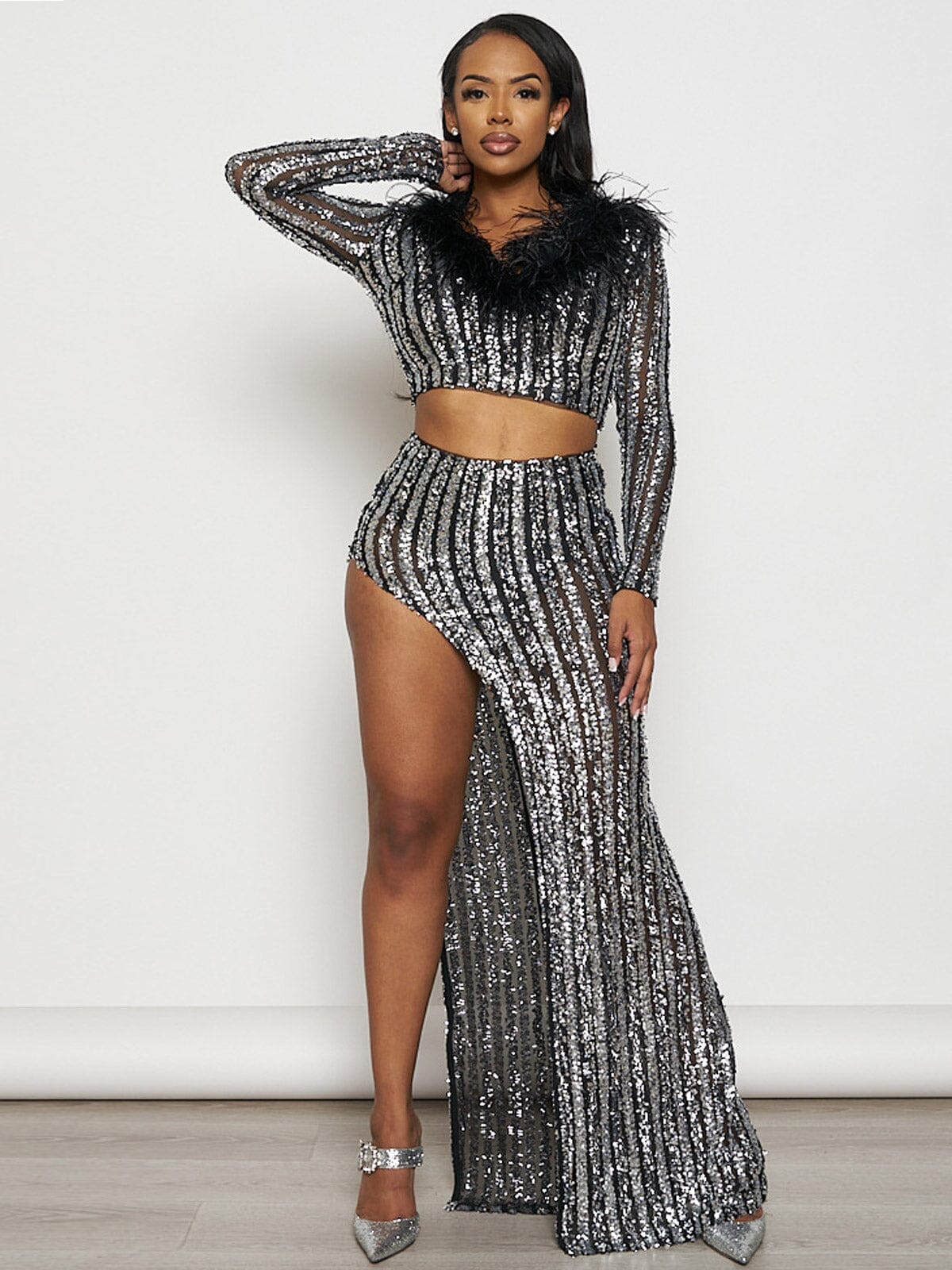 Discover the allure of our Feather Sequin Two-Piece Ensemble, a chic combination of a long-sleeve crop top and a maxi skirt with a zipper detail. This set is crafted with luxurious feather sequins that catch the light beautifully, making it a perfect choice for evening events or upscale gatherings. The duo's modern silhouette and comfortable fit make it a bestseller with boutiques looking for trend-forward pieces that captivate and charm.