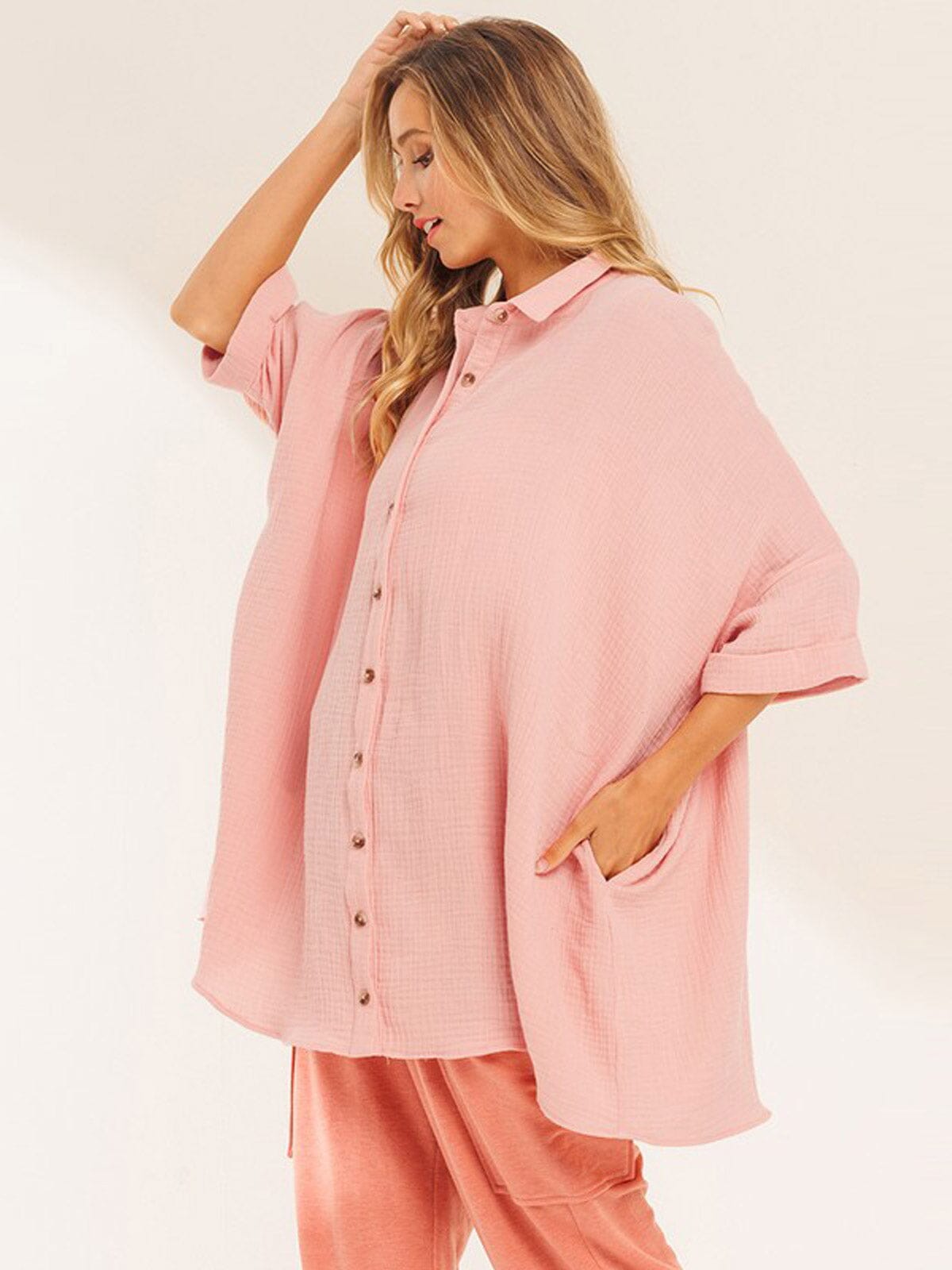 Introducing our must-have women's 3/4 sleeve button up tunic blouse, a trend-forward layering piece perfect for any boutique. Made from 100% cotton, this blouse features a classic button-up front and convenient front pockets, making it both stylish and functional. The relaxed silhouette and 3/4 sleeves make it an ideal choice for any season, while the versatile design can be dressed up or down for any occasion.