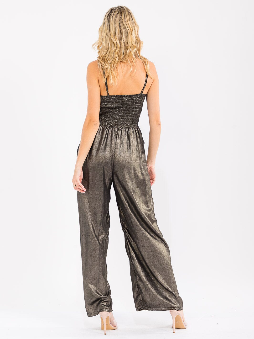 Features:V-neck design, keyhole detail, wide-leg silhouette, front pockets, sleeveless, shimmering fabric, perfect for layering.