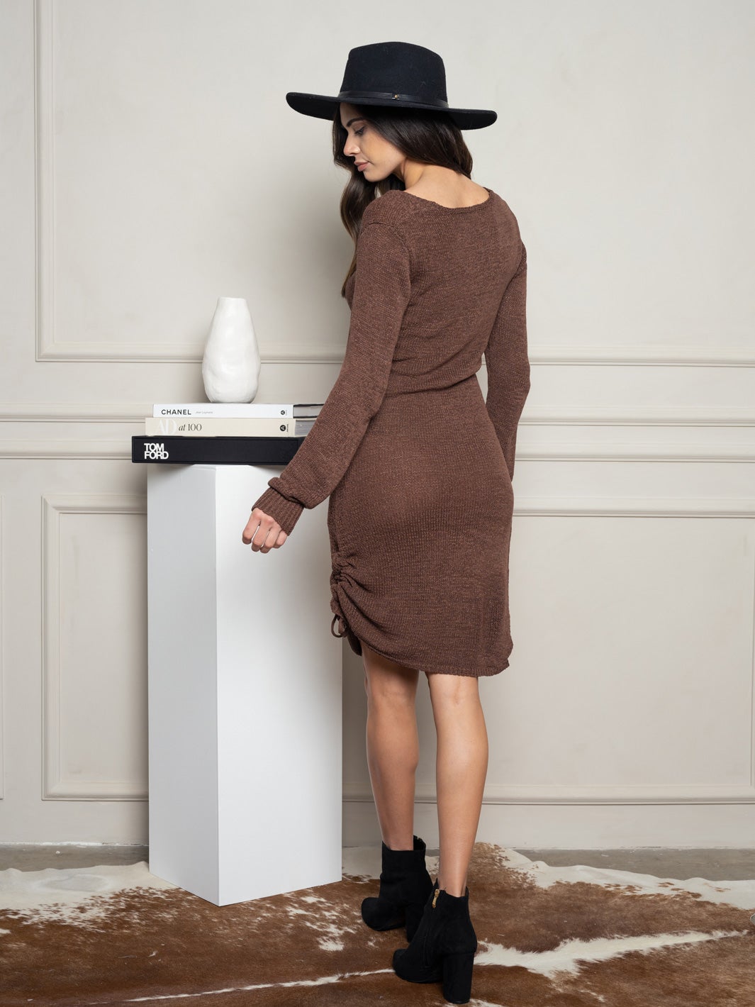 Discover the exquisite appeal of our Women's Ruched Midi Sweater Dress, a chic choice for any curated collection. Crafted with precision, this dress features long sleeves and side ruching, highlighting a flattering silhouette that works for any occasion. Perfect for layering or wearing solo, it becomes a trend-forward piece that every stylish boutique needs in their autumn and winter lineup.