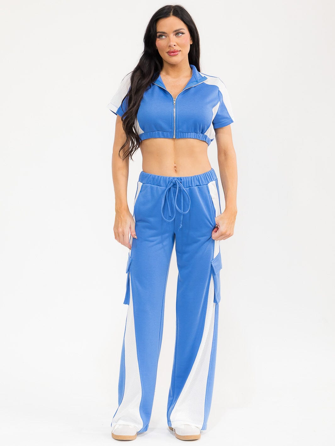 This stylish two-piece ensemble, featuring a short-sleeve crop top and elastic waist pants, is a chic addition to any retail collection. The colorblock design combined with a cozy polyester-spandex blend makes it perfect for everyday elegance or casual outings. This versatile set is a bestseller for boutique owners looking for trend-forward, must-have pieces for their customers.