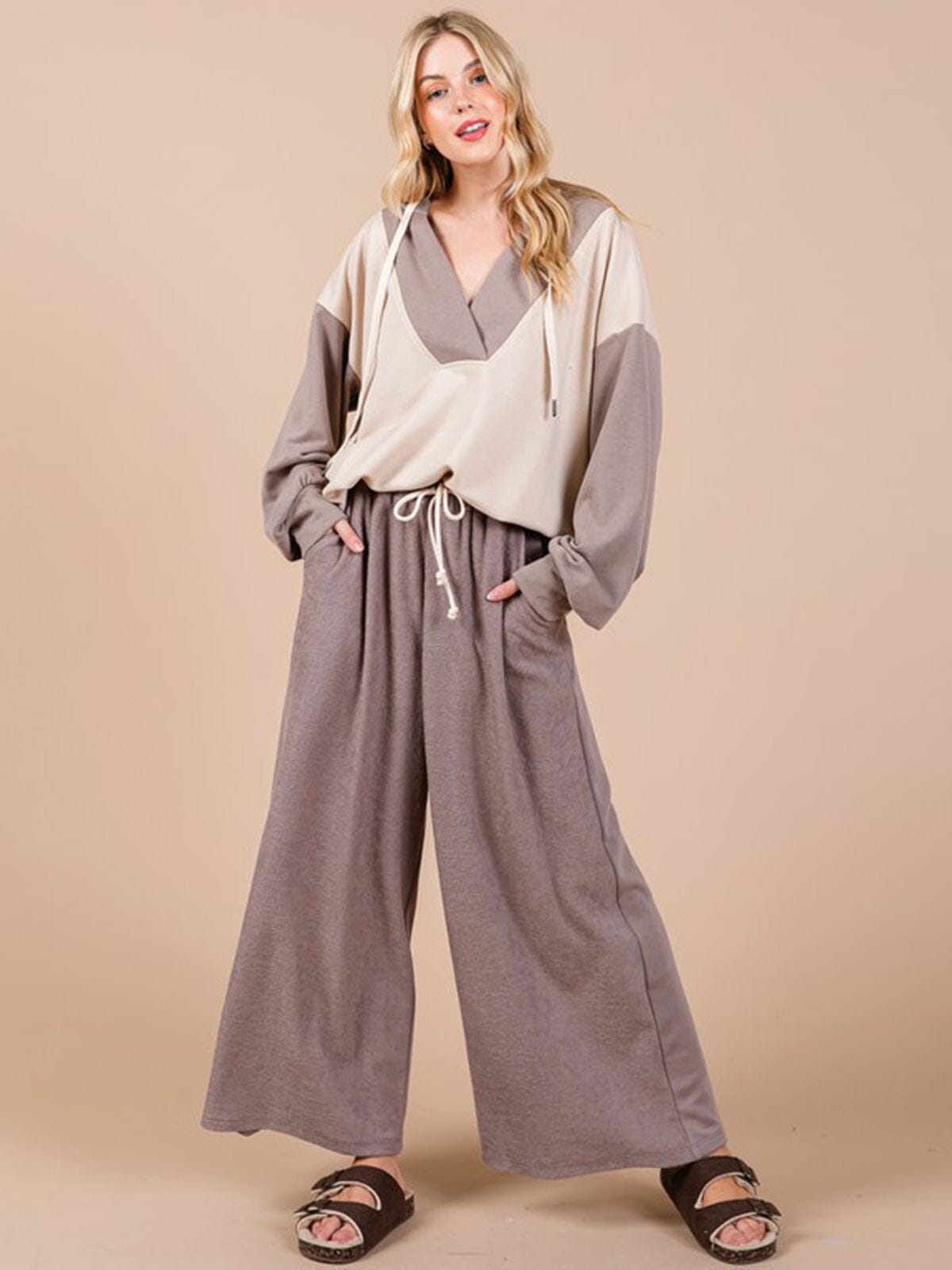 WOMEN'S LONG SLEEVE V-NECK HOODED COLORBLOCK OVERSIZED TOP