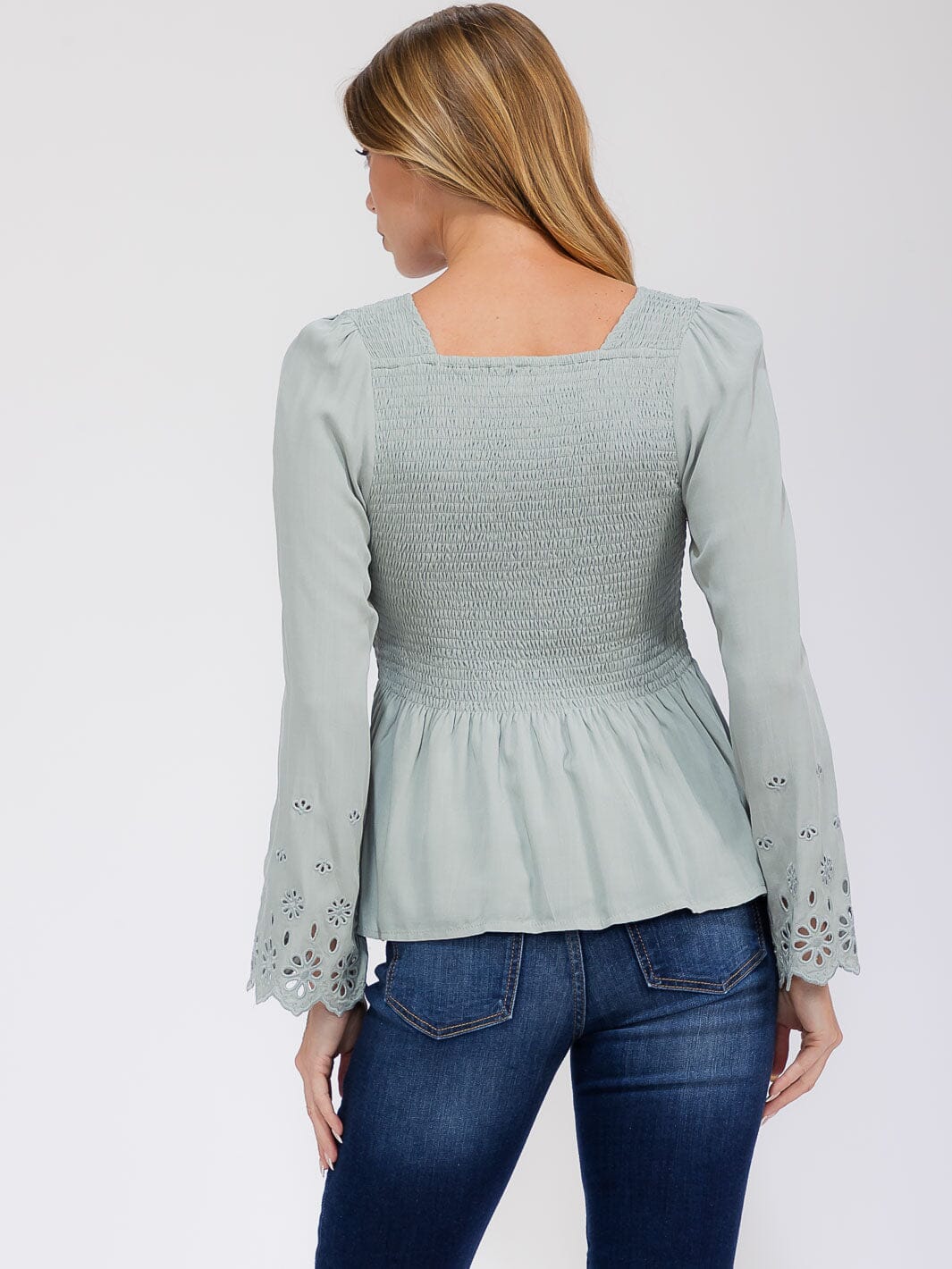 Features:Soft rayon fabric, eyelet sleeve detailing, square neckline, smock peplum design, versatile styling options, perfect for spring and autumn, popular with boutiques.