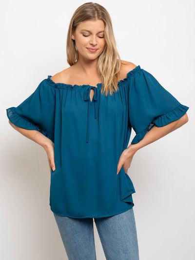 WOMEN'S OFF SHOULDER FRONT TIE TOP - This top is a top-seller with boutique owners due to its versatility and trend appeal. Its lightweight fabric and flattering silhouette make it a comfortable and stylish option for any occasion. With a high markup potential and reliable reordering, this top is a valuable addition to any retailer's inventory. Its eye-catching design is perfect for in-store or online displays, making it a must-have for fashion resellers and online retailers.