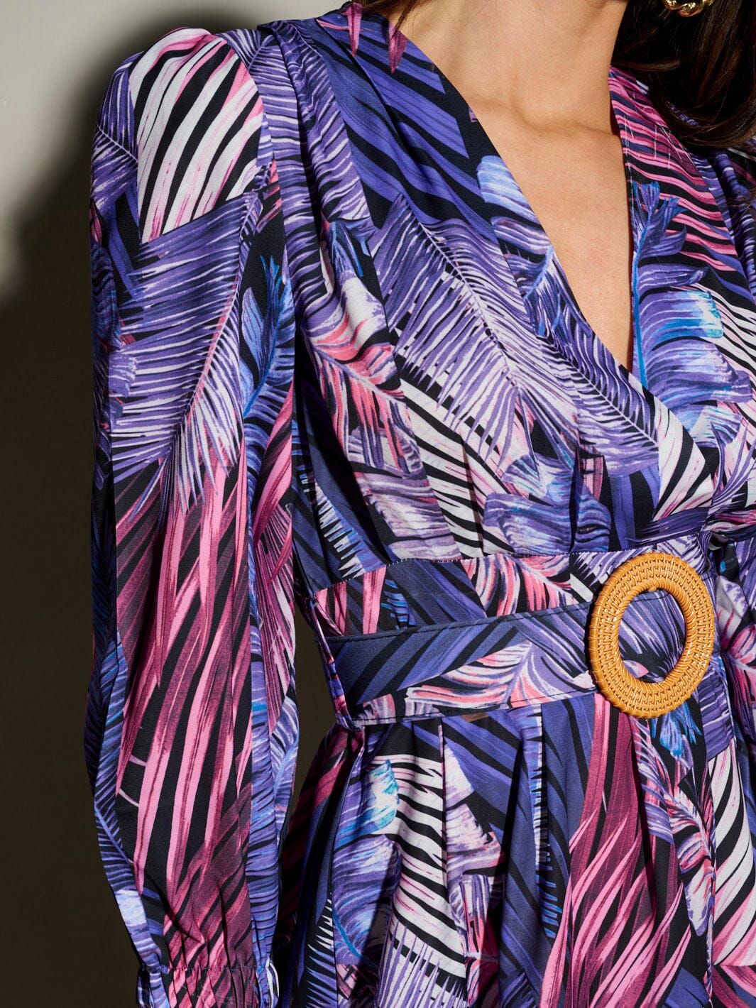 Lightweight polyester fabric, flattering surplice neckline, vibrant multi-print design, versatile day-to-night wear, trend-forward silhouette, boutique favorite, effortless elegance.