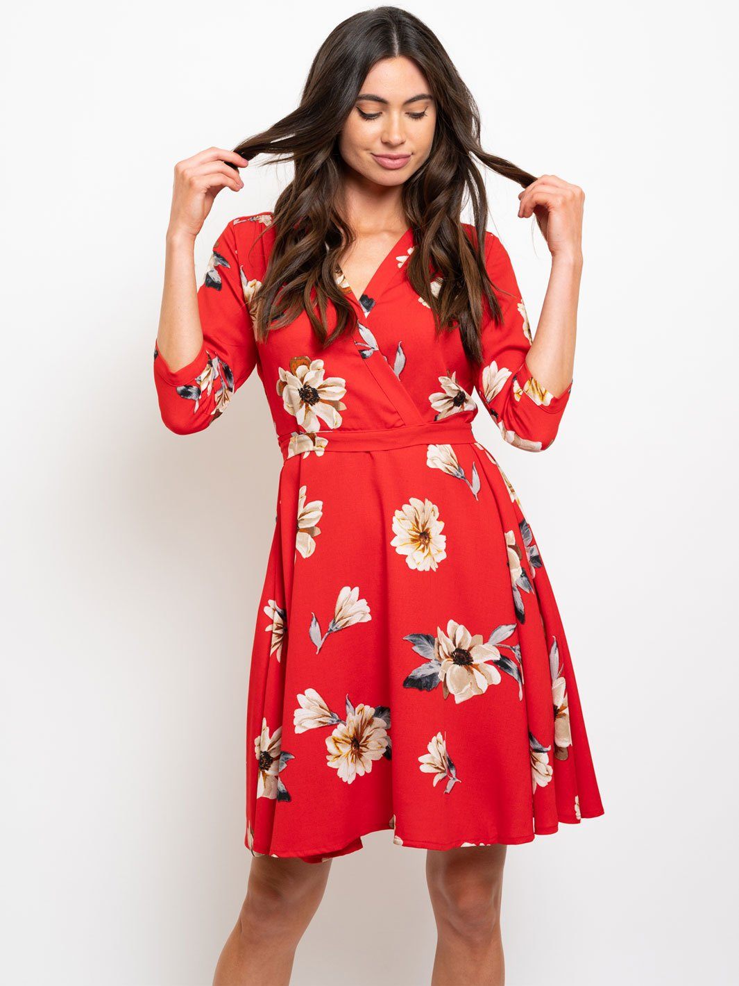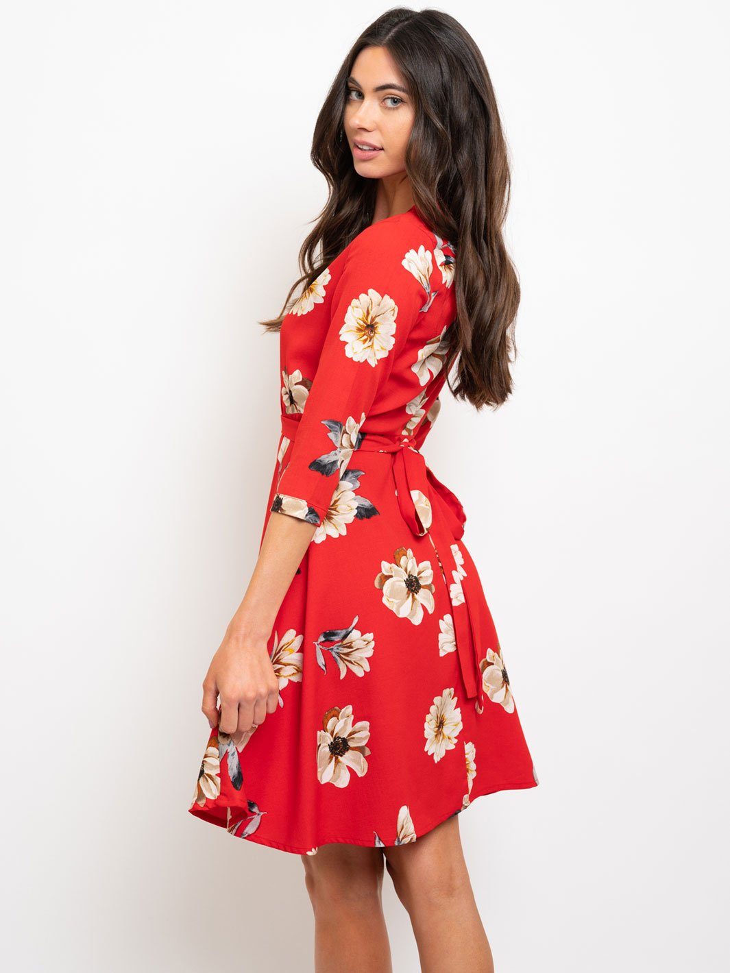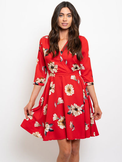 WOMEN'S RED FLORAL WRAP MINI DRESS