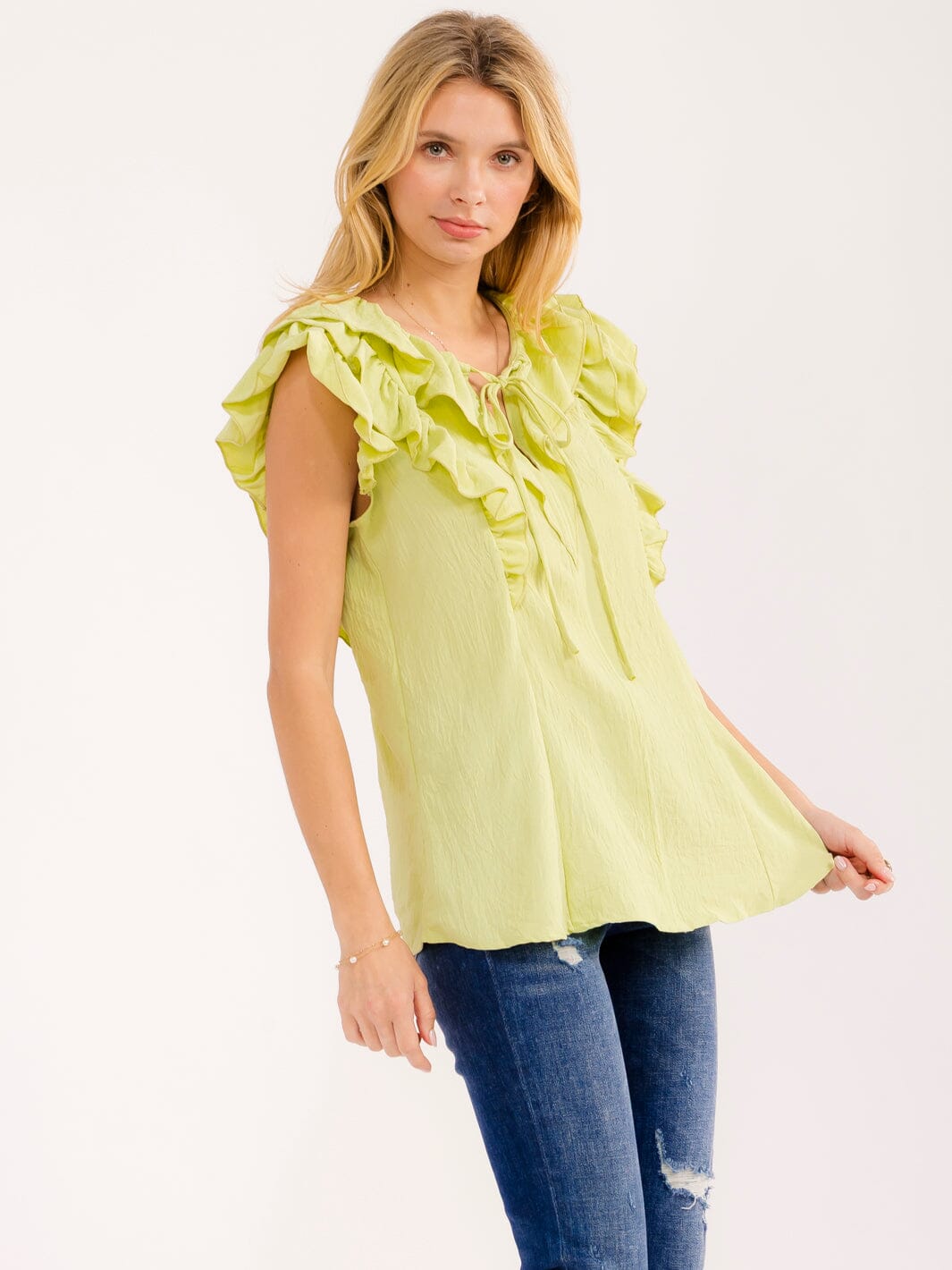 Features:Lightweight 100% polyester construction, relaxed fit with a flattering v-neckline, sleeveless design with ruffle trim, easy hand-wash care, made in the USA for quality assurance, versatile enough for layering or solo wear, offered in fashion-forward lime and fuchsia colorways.