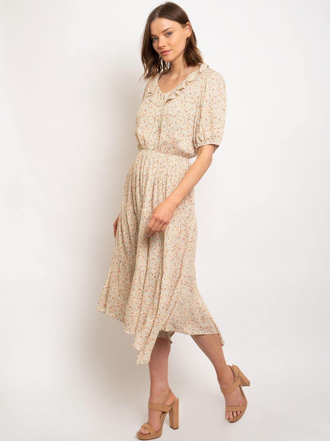 WOMEN'S RUFLE NECK BUTTON DOWNTIERED MIDI DRESS