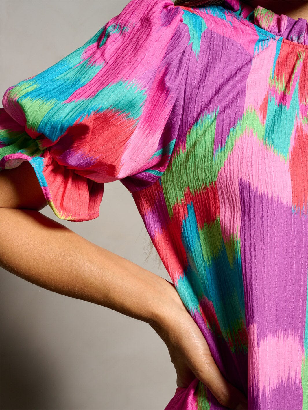 100% polyester fabric and lining, short puff sleeves, mock neck, unique multi-print design, versatile styling options, seasonless appeal, comfortable fit.