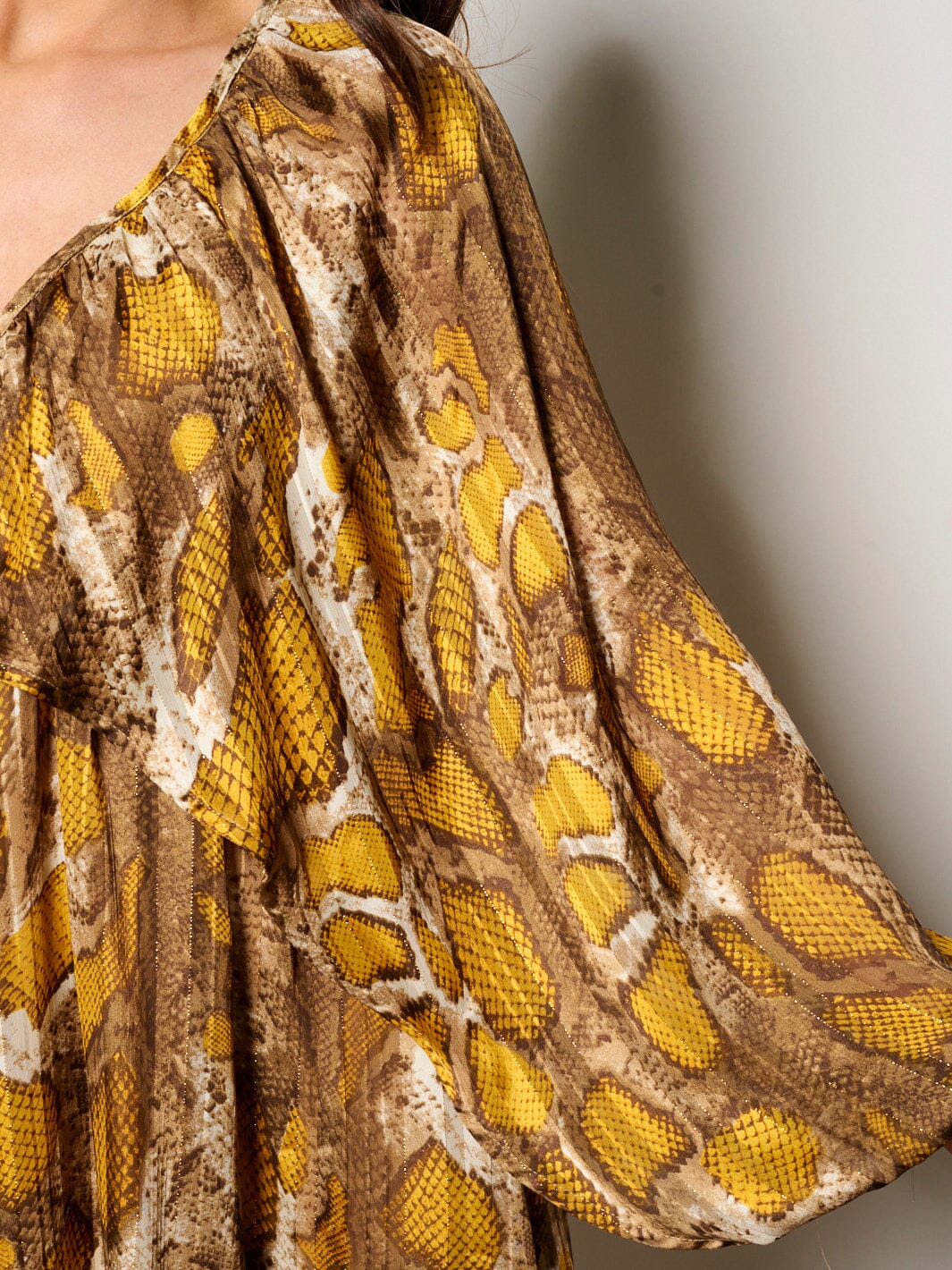 The must-have for boutiques: This statement piece, the Women's Long Ruffle Sleeve V-Neck Tunic Snake Print Mini Dress, is the perfect addition to any retailer's collection. Its flattering silhouette, luxurious fabric, and unique snake print design make it a trend-forward layering piece that is sure to be a bestseller with boutiques. Whether styled up or down, this dress is a versatile option for any occasion.
