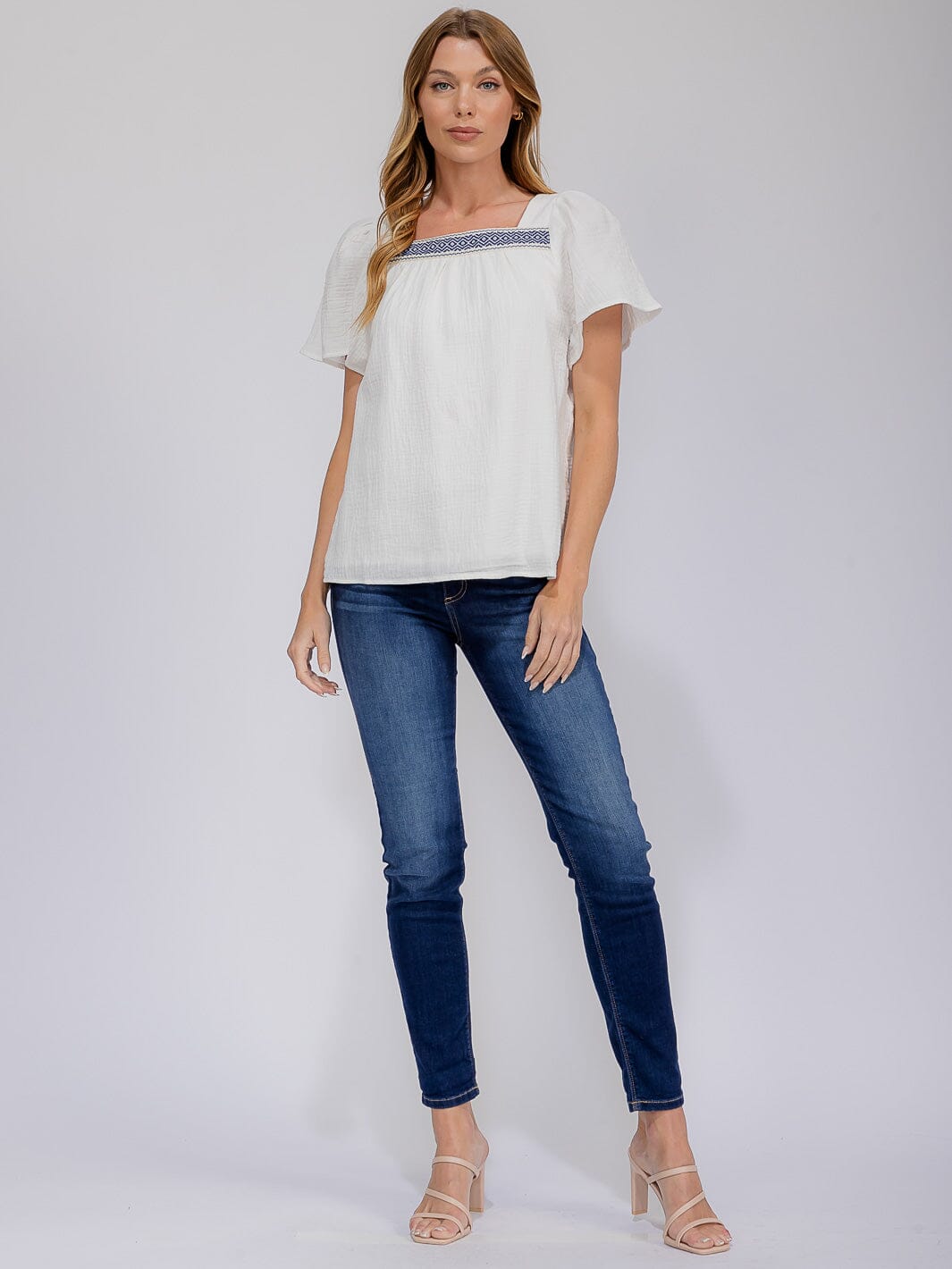 WOMEN'S SHORT RUFFLE SLEEVE SQUARE NECK TRIM DETAILED TUNIC BLOUSE