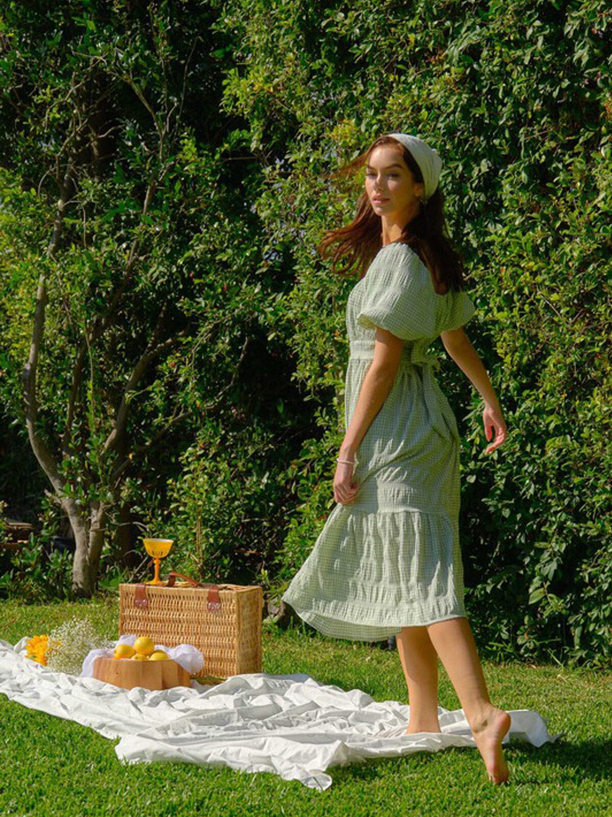 Lightweight and breathable material, puff sleeves, square neckline, tiered design, plaid pattern, midi length.