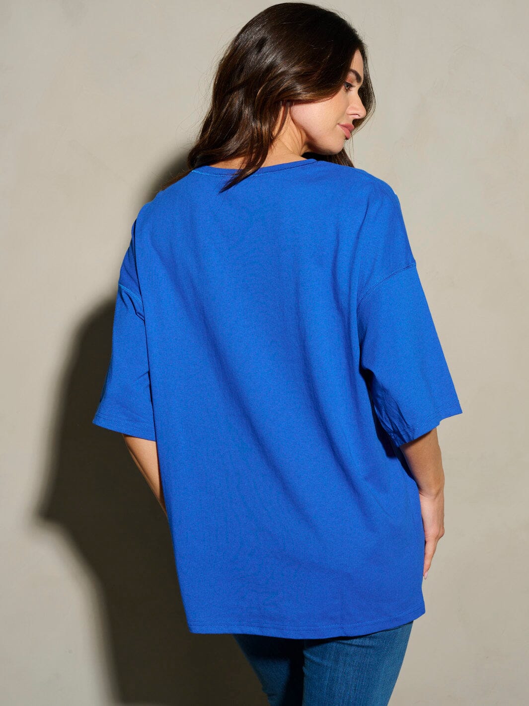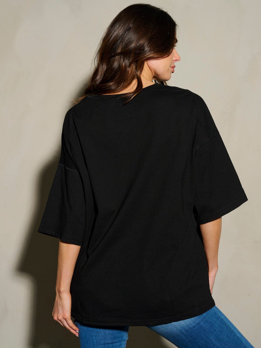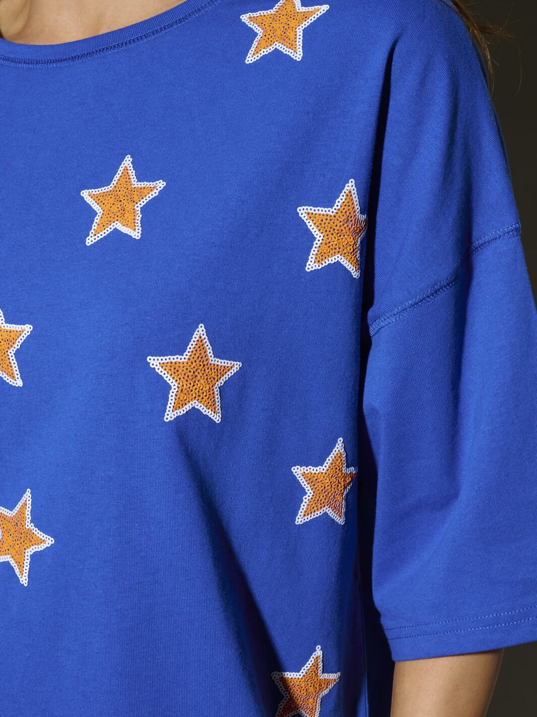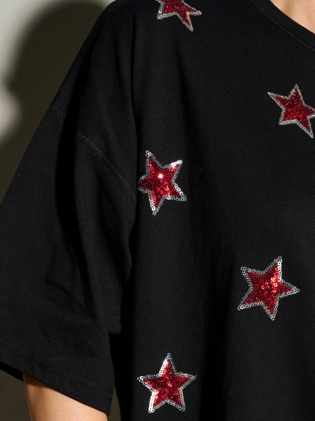 100% cotton fabric, short sleeve silhouette, sequins stars design, hand wash care, made in China, model is wearing size S, versatile styling options.