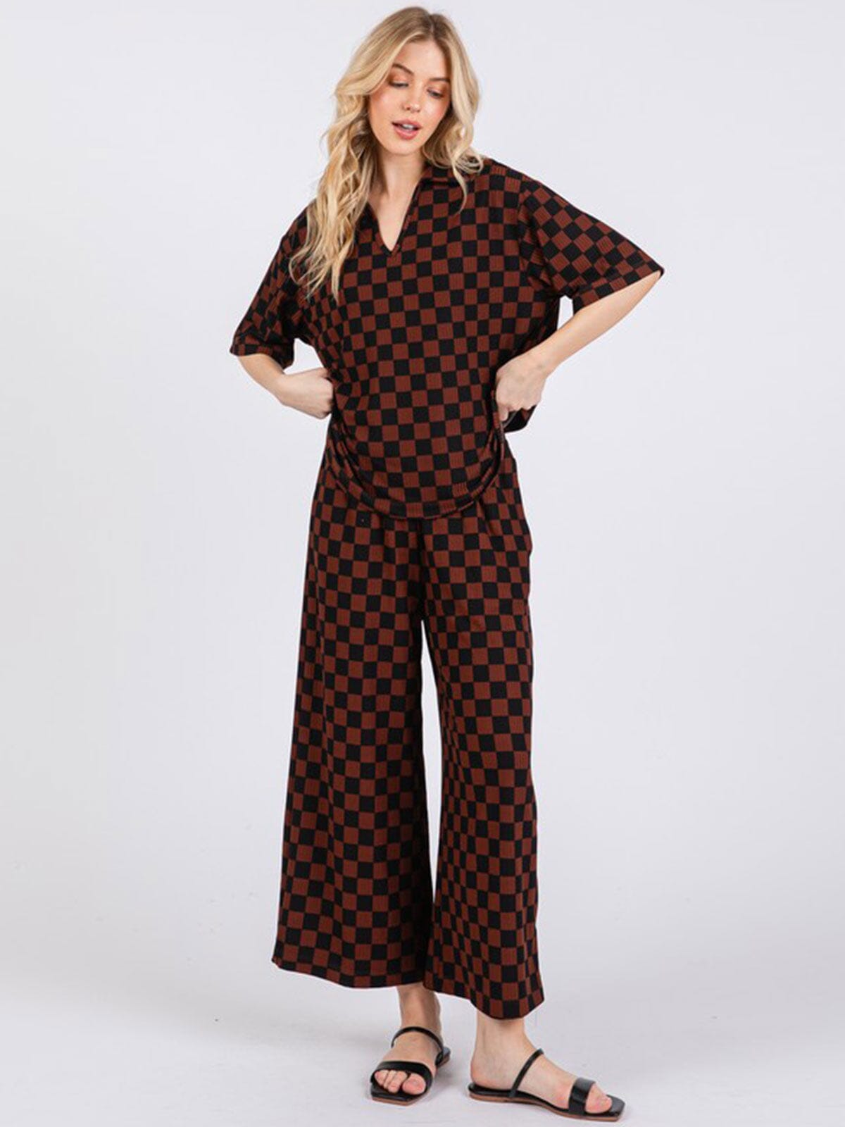 WOMEN'S SHORT SLEEVE TOP & ELASTIC WAIST PANTS CHECKER PRINT 2PC. SET