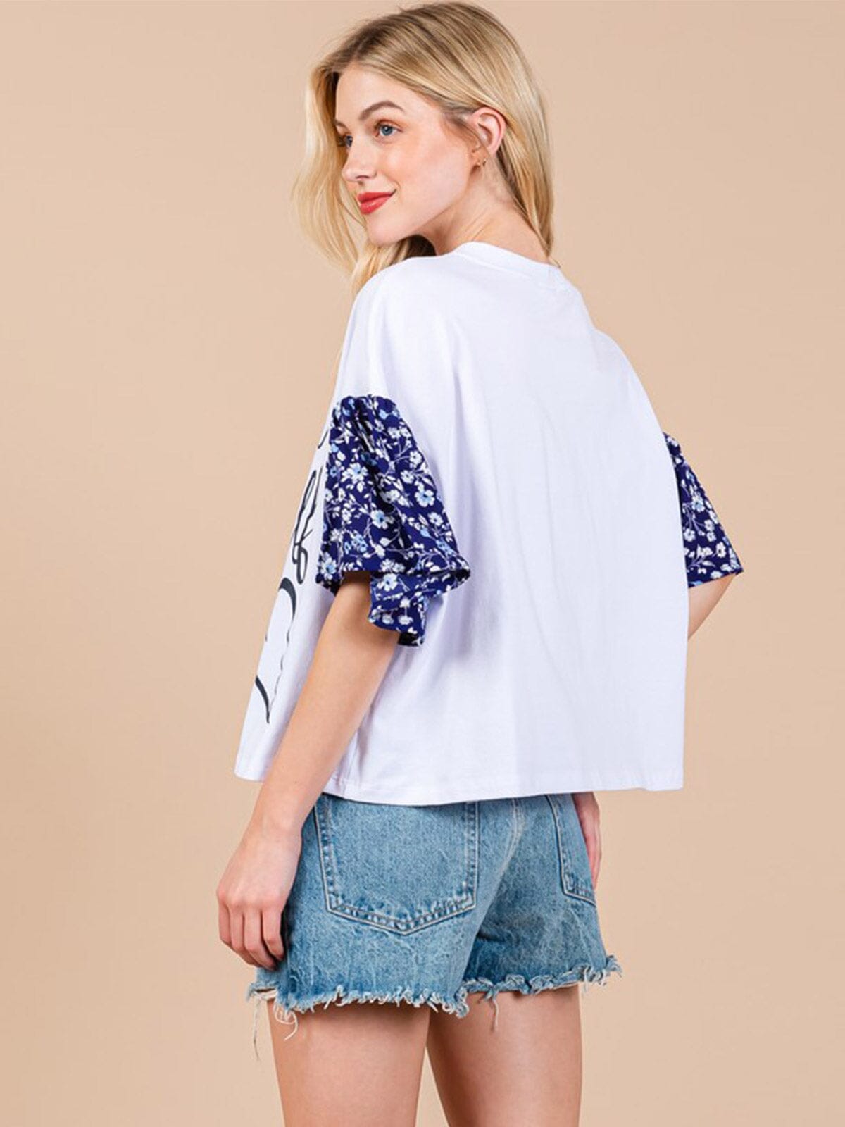 Features:Soft cotton-spandex blend, relaxed fit, floral sleeve detail, versatile styling options, perfect for layering, ideal for all seasons, appealing to boutique shoppers.