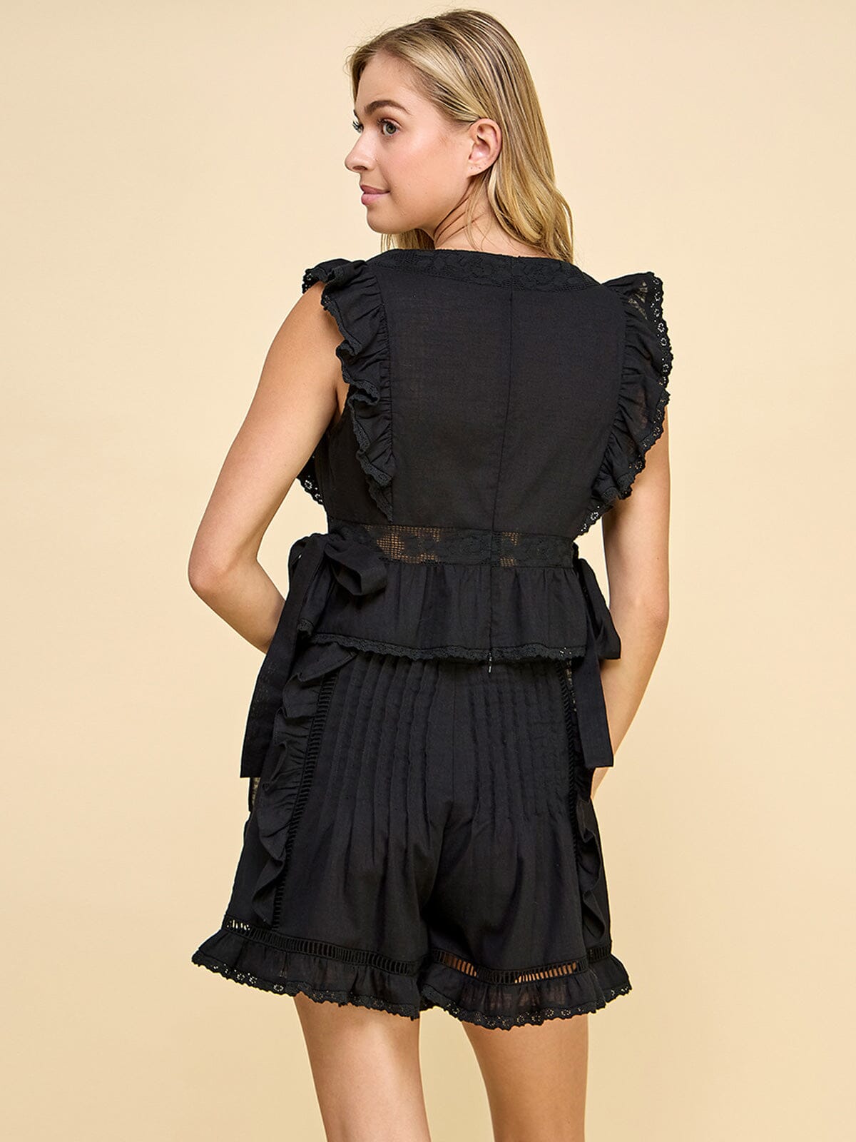 This chic sleeveless top and ruffle shorts set offers a modern twist on casual elegance. Crafted with an airy cotton and rayon blend, the top features a flattering silhouette that pairs seamlessly with the playful, ruffled mini shorts. Perfect for trendy boutique collections, this ensemble is ideal for casual summer outings or as a versatile layering piece in any wardrobe.