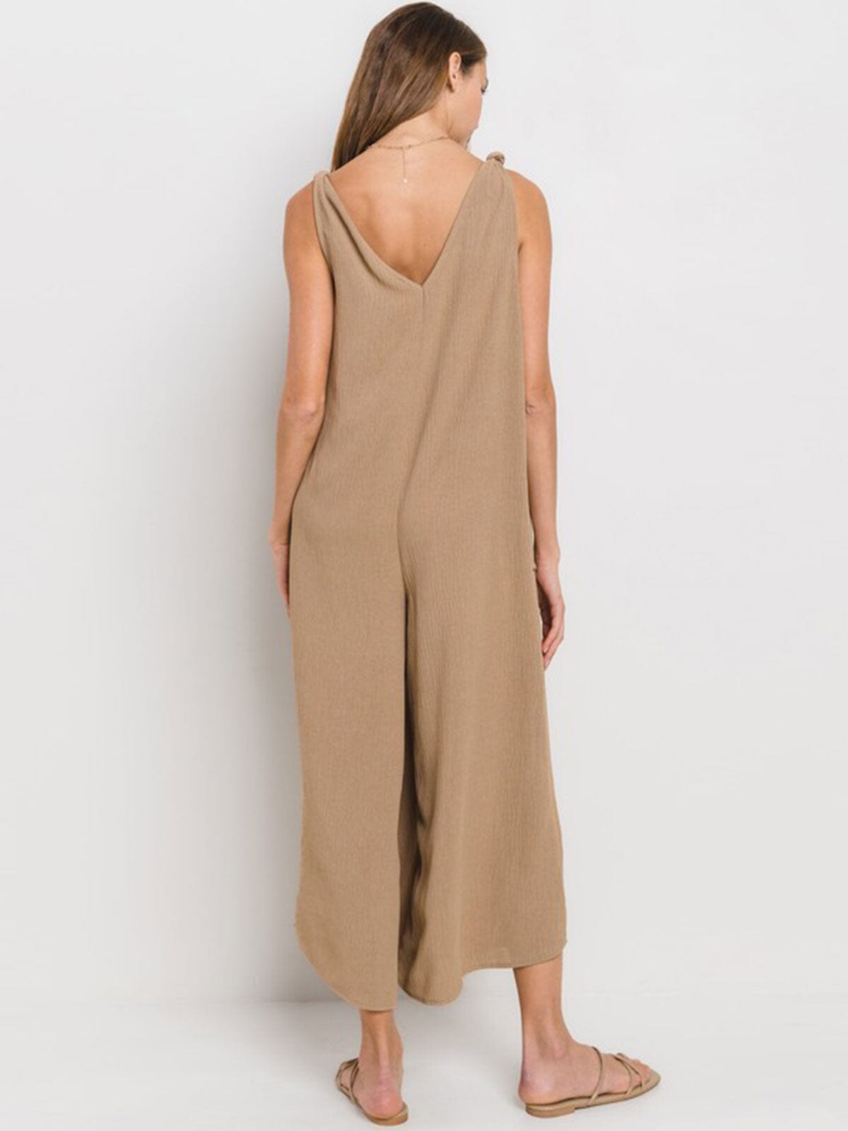 WOMEN'S SLEEVELESS V-NECK FRONT POCKET WIDE LEG JUMPSUIT