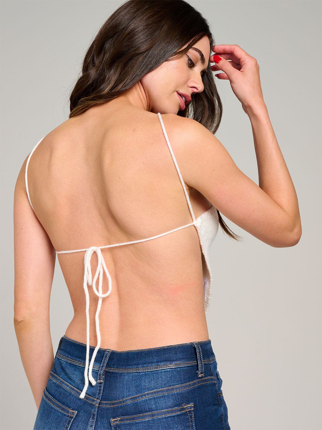 Features:Soft knit fabric, open-back design, halter neck style, versatile layering piece, trendy crop length, perfect for spring and summer, boutique favorite.