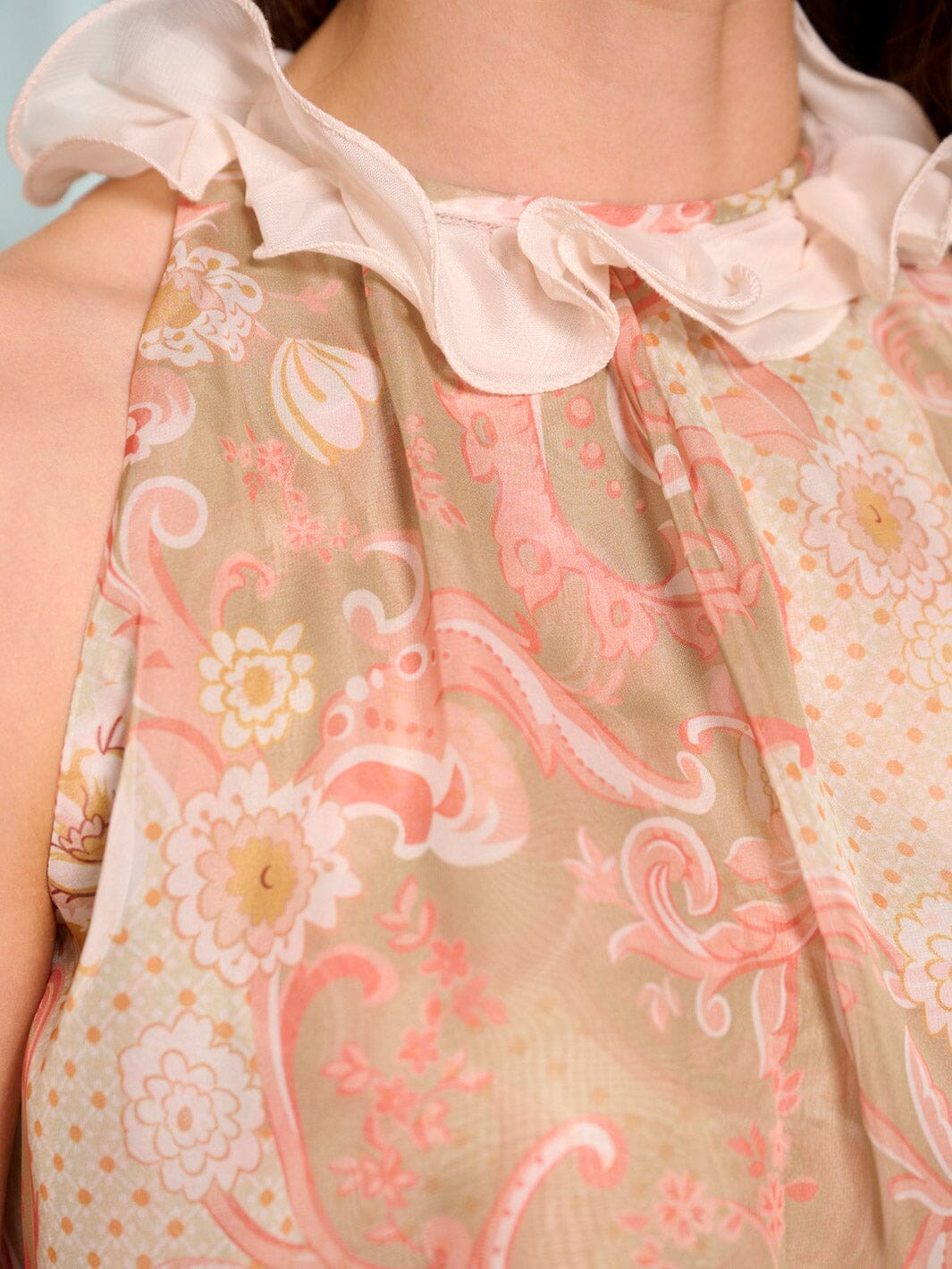 Lightweight polyester fabric, flattering halter silhouette, ruffle neckline detail, versatile for layering, available in multiple prints, easy dry-clean care, on-trend design.