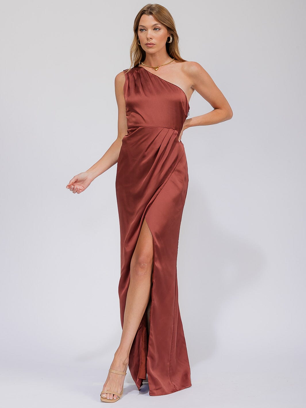 Lightweight polyester fabric, elegant one-shoulder style, flattering surplice front, sophisticated front slit, perfect for evening or formal wear, must-have for event styling, comfortable fit.