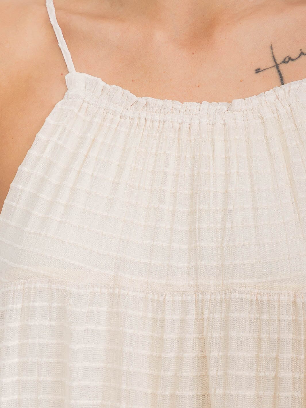 Sleeveless, adjustable straps, tiered tunic silhouette, 100% polyester, hand wash, made in China, model is wearing size S Length: 31" Bust: 30" Waist: 18".