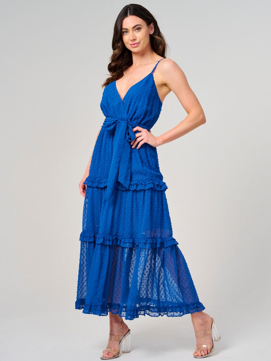 Elevate your boutique's collection with this sleeveless Swiss dot tiered dress. Its elegant surplice neckline and flowing maxi silhouette offer a timeless look that appeals to a wide range of customers. Crafted from light, airy fabric, this dress is perfect for warm weather events or as a standout piece in a layered ensemble. A must-have for retailers seeking trend-forward pieces that promise to capture attention.