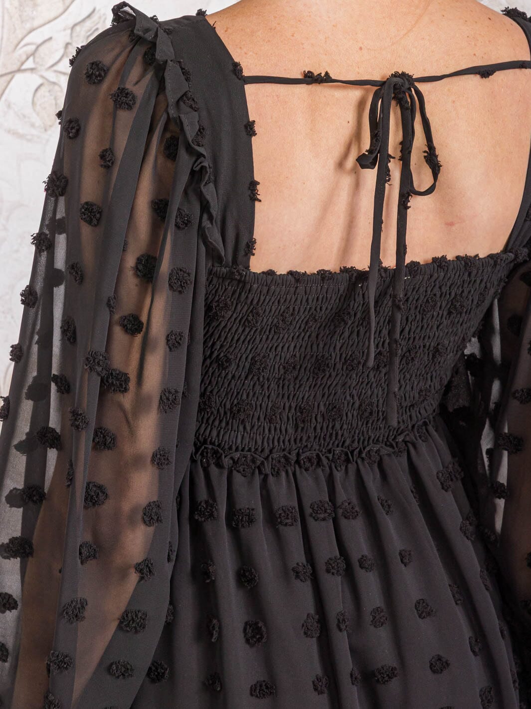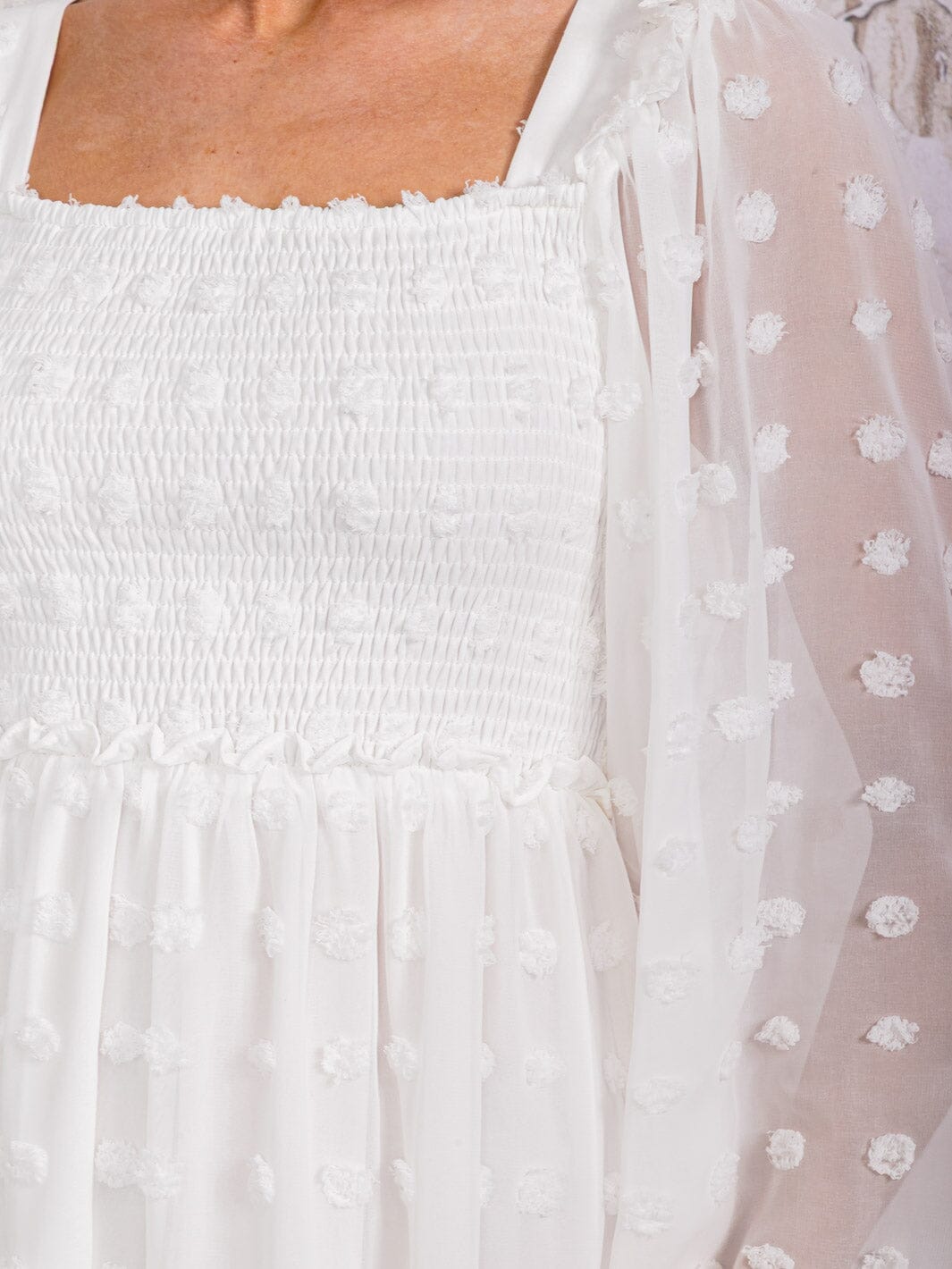 Features:long sleeve design, square neck, tiered silhouette, Swiss detailing, breathable fabric, versatile style, mini length, lightweight, easy to style
