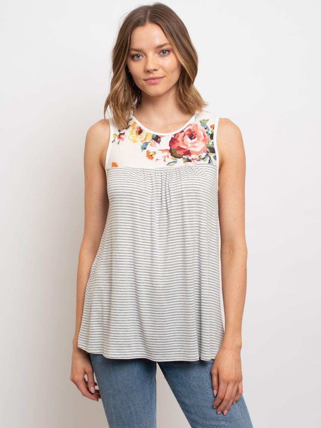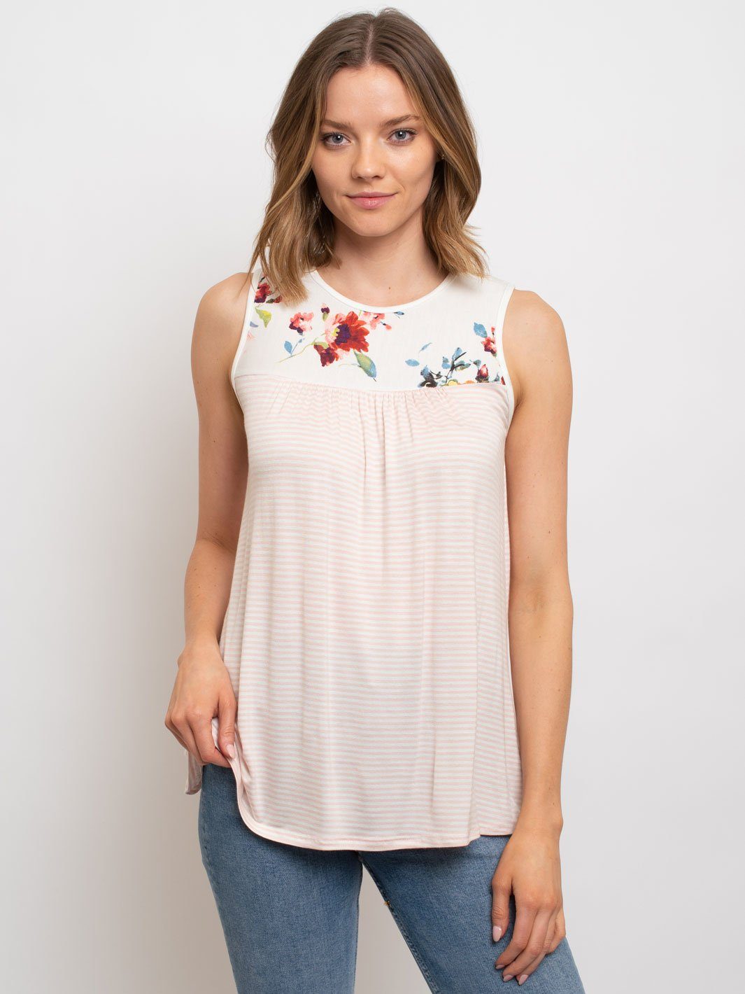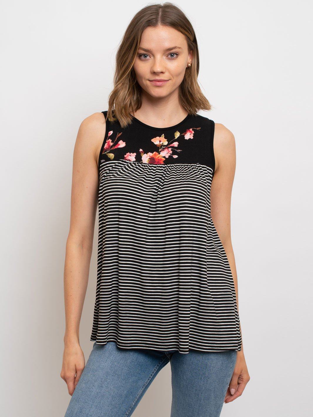 Complete the look:The Women's Sleeveless Tunic Floral Pin Stripes Top is a popular item among boutiques for many reasons. With its versatile styling options and high-quality fabric, it has a high markup potential and is a reliable reorder item. Its trend-forward design appeals to fashion-forward customers and its lightweight and comfortable fabric make it a popular choice for in-store and online display. Don't miss out on adding this fashionable and profitable piece to your collection today.