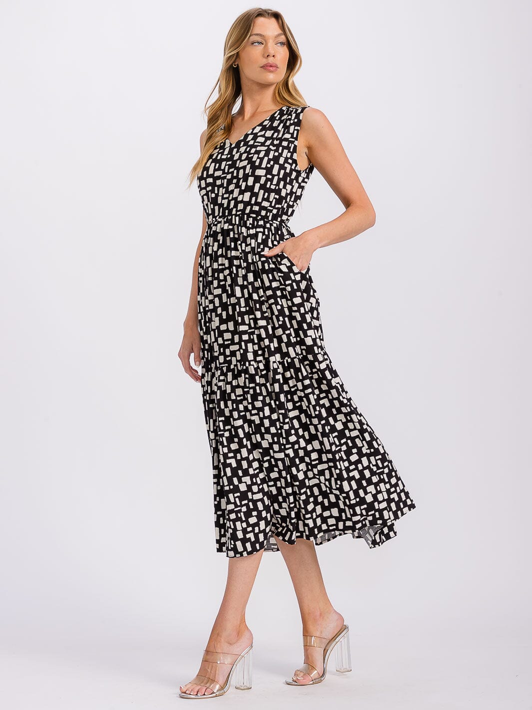 WOMEN'S SLEEVELESS V-NECK ELASTIC WAIST POCKETS PRINTED MAXI DRESS