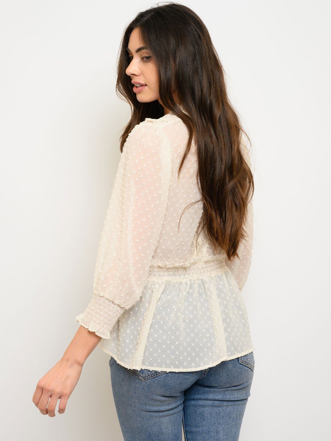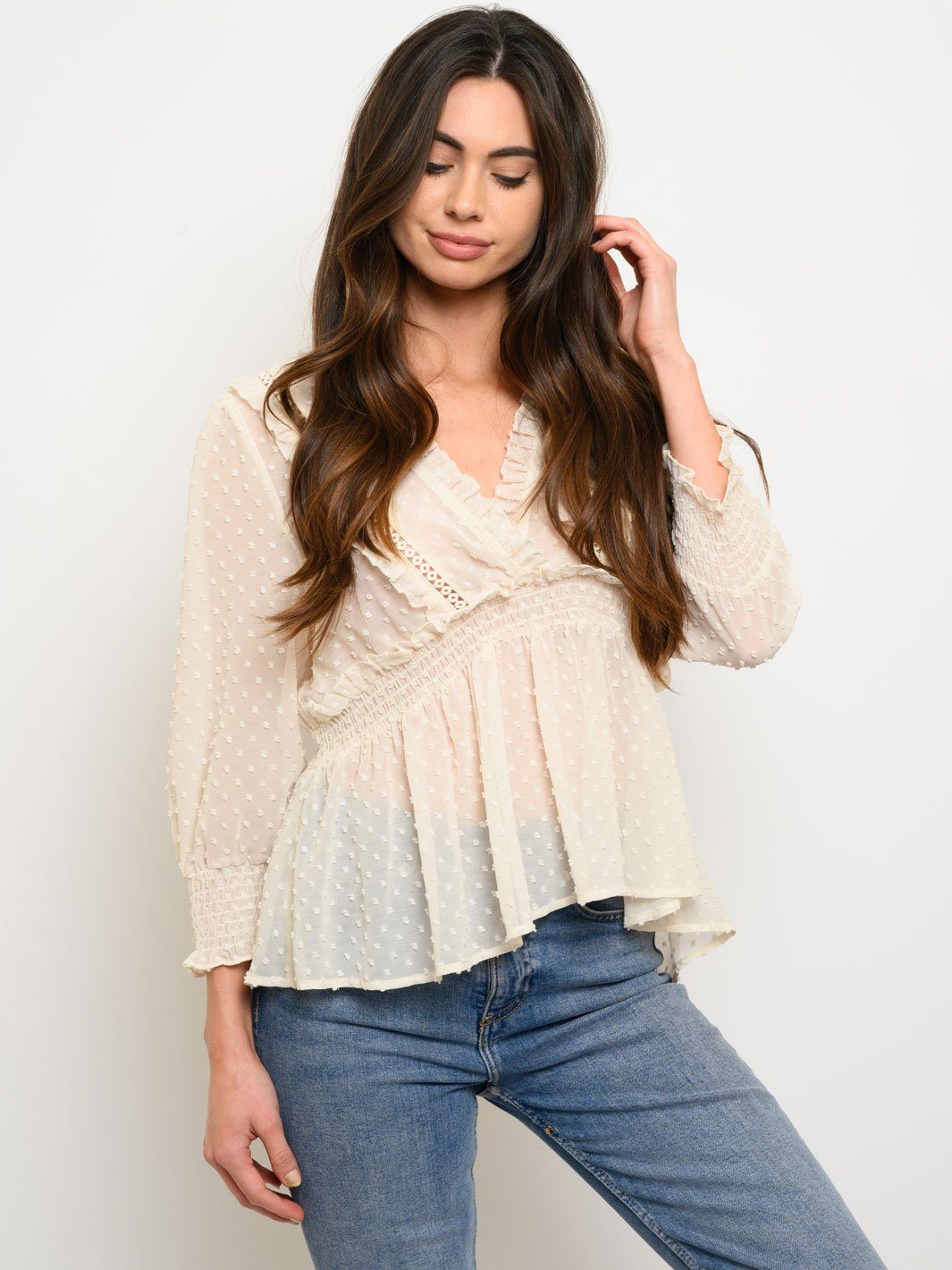 Features:Soft and lightweight material, flattering v-neck design, delicate swiss dot lace trim, versatile styling options, perfect for all seasons, comfortable to wear, appeals to boutique customers.