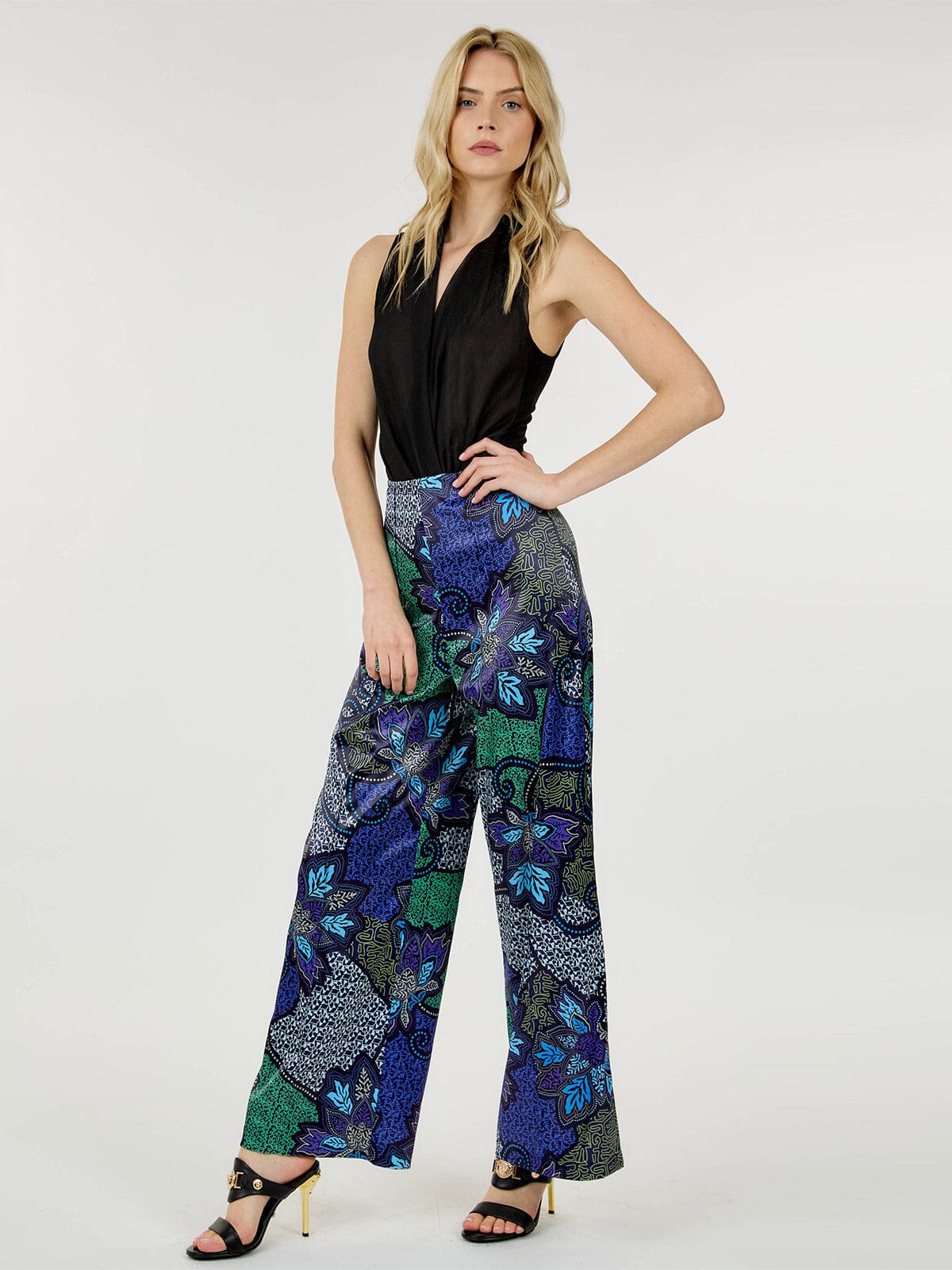 Features:Soft polyester-spandex fabric, wide-leg silhouette, vibrant multi-print design, ideal for all seasons, perfect for casual and formal styling, high boutique appeal.